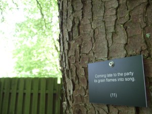 I made What is a tree? for the Midsummer Arts Festival at Aden Country Park, near Mintlaw, Aberdeenshire, on Sunday 19 June. It’s a set of poems on botanical labels attached to trees around the park. The poems aim, as in a riddle, to provide an initially puzzling, but also recognisably accurate, description of the tree in question.
