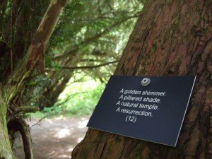The work I’ve made is called DEA SILVARUM (Goddess of the Woods), as Ovid describes Diana, and is a walk with poems on the theme of hunting in the gardens and grounds of Traquair House. The poems include Ted Hughes’ version of Ovid, plus works by Robert Burns, Edna St Vincent Millay and the great Anon, among others. I led a first walk at the exhibition opening on 5 September, and will lead a second on Saturday 10 October at 2.30pm.