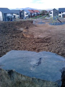 The fifth uses a boulder found on site, the top of which has been smoothed flat. It sits in an as yet unfinished playpark, with views across the estate to the Pentland Hills in the distance.